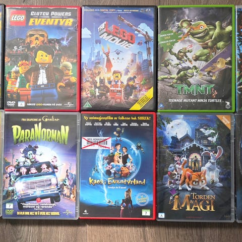Fire DVD-filmer med LEGO-tema, inkludert LEGO Star Wars: The Yoda Chronicles og LEGO Batman: The Movie. Filmene er animert og passer for barn og familier. Inneholder flere eventyr og historier basert på populære LEGO-serier. Selges kr 150 samlet. Kan også selges enkeltvis