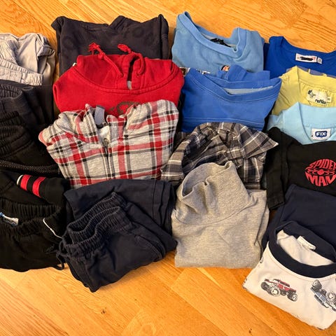 Stor klespakke til gutt str.110-116 og og noen 122. Inkluderer joggebukser, pysjamas, t-skjorter, bluser, skjorter, jakker, hansker, luer, ullsokker.