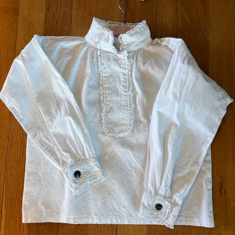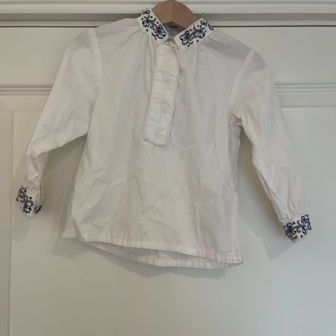 Hvit bluse med mørke velurbånd fra Polarn O. Pyret str. 110, 4-5 år selges. Pent brukt.