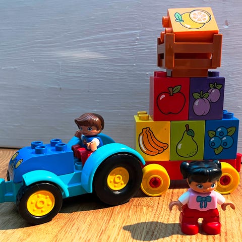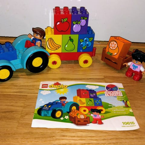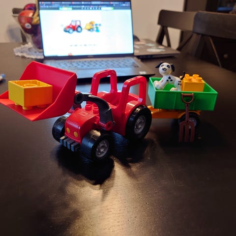 Flott DUPLO sett for den som liker gård, motor og dyr. Traktoren m henger, figur og hund er fra 2011 og har modell nummer 5647 og er komplett. Men siden det hører med å ha litt dyr på gården, så har vi lagt til 2 katter, geit, sau, gris og en kanin. Og litt blomster og et gjerde.