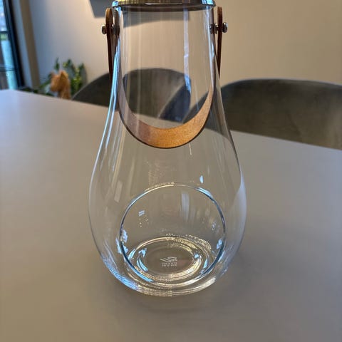 Lanternen er munnblåst i klart glass med et håndtak i fullnarvet lær.