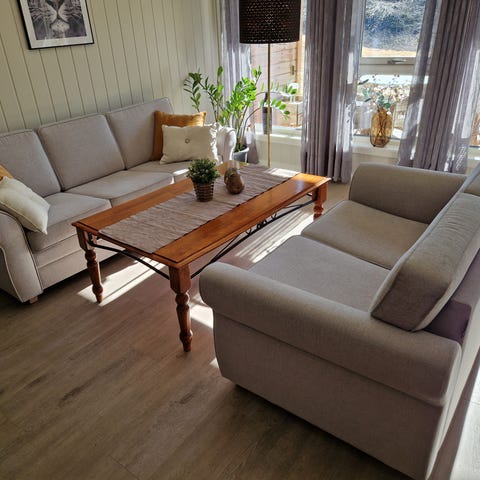 Gruppen inneholder 2 sofaer, 1 pall med litt oppbevaring og salongbord. Dette er en solid sofagruppe fra Skag møbler. Trekkene på alle puter kan tas av og vaskes. Lett rengjøring med fuktet klut for eventuelle flekker.