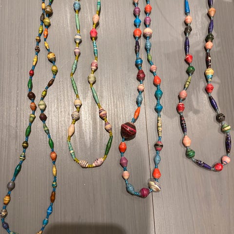 2stk smykker laget av trematerialer, plast (kanskje skjell?)og lær.