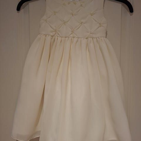 Brudepike kjole I fargen Ivory. Kjolen er pent brukt engang, en liten flekk på beltet bak (går mulig av om den renses) kjolen er merket str 6 år. Fremstår som liten I størrelse og ble brukt av en høy, men slank jente på 4 år.