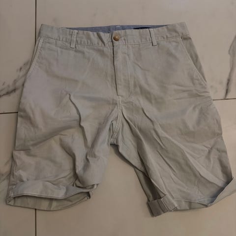 Polo Ralph Lauren gutt shorts i størrelse 164. Shortsen er beige og har et stripete belte i svart, hvitt og gult. Materialet ser ut til å være bomull eller en bomullsblanding. Shortsen har lommer foran og bak.