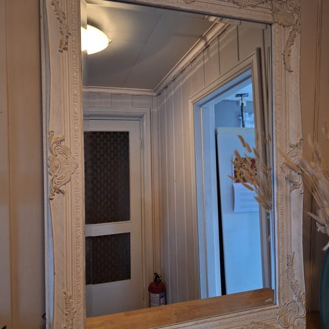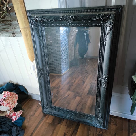Dekorativt veggspeil med profilert grå ramme og fasettslipt glass. Måler 65cm høyt, 55cm bredt og 4,5cm dypt. Oppheng bak. Hentes på Torshov. Heis. Buss 20 og 30 stopper rett utenfor.