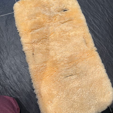 Selger sitteunderlag i ull til barnevogn.