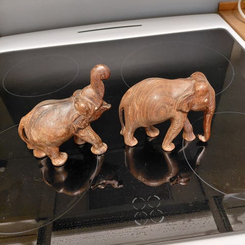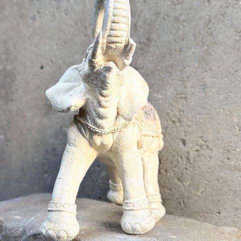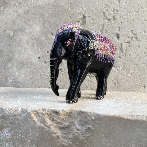 Selger et sett med 6 elefantfigurer i tre og stein. Ulike størrelser, fra små til store. Én elefant har utskårne indiske motiver. Passer fint som pynt, gave eller for samlere.