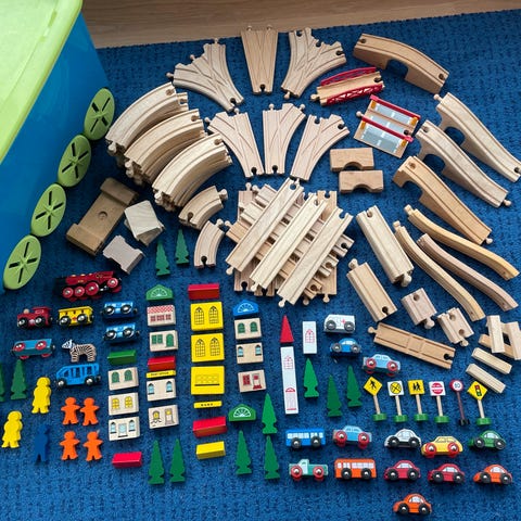 BRIO Trelekesett på minst 115 enheter består av et komplett togbanesystem med ulike skinneelementer, broer, tunneler, biler, tog, figurer og trær. Settet inkluderer rette og buede skinner i tre, en grønn bro, flere små kjøretøy og passasjerfigurer i ulike farger. Materialet er hovedsakelig tre med noen plastdetaljer. Noe nytt, noe vintage. Ikke alt er original Brio, men alt fungerer sammen. Det medfølger et elektrisk Thomas toget tog. En tidløs klassiker med masse lek igjen. Selges samlet.