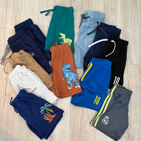 To stk lyseblå jeans shorts, en grønn og en mørkeblå bomulls-shorts. Ulike merker. Shortsene har elastisk midje eller knapper for justering og lommer for praktisk bruk.
