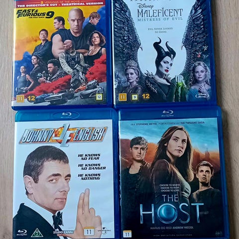Indiana Jones, Tangled (To På Rømmen), The Shoemaker, og G.I. Joe. Filmer på Blu-ray format med norsk tekst og aldersgrense angitt på cover. Passer for filmfans og samlere.