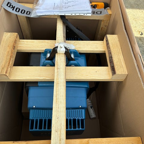 1t demag kjettingtalje fra 2007. Har 5m skinne som løpekatten passer i