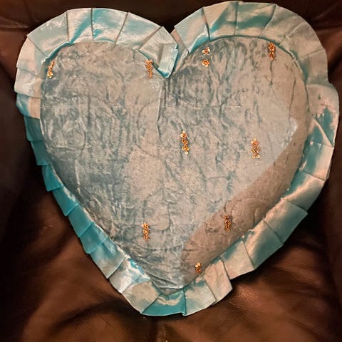 Hjerte pute i rødt velurstoff.