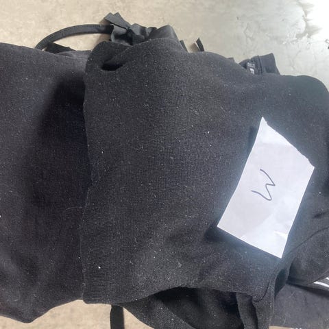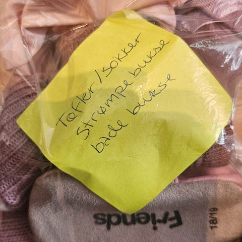 trusestrømper og gummisokker, luer og smokker som ikke har vært brukt, og en pakke med silikonsmokker i størrelse M har heller ikke vært brukt