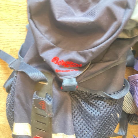 Har 2 like, barne-sekker: Bergans, "ryggplata" er ca 30cm. Veldig lite brukt, har bokstavene HA og CM trykket på lokket, men disse kan d settes en "cuul" lapp over.....200,- pr.stk