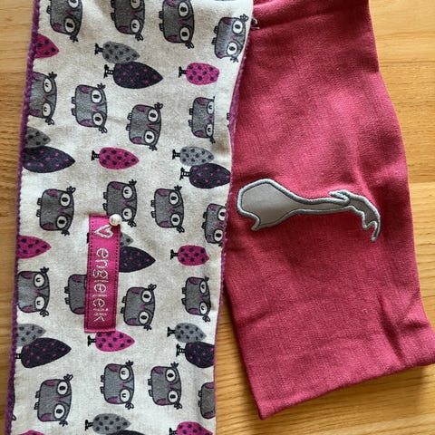 Wooland pannebånd i marineblå, rosa og hvit. Med refleks. One size, men synes den passer str. 2-5 år