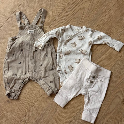 Nydelig hjemmestrikket hentesett til nyfødt. Brukt 1 gang og fremstår som ny. Strikket i merinoull. Bladmønster på jakke og rompen. Rosa hjerte knapper på jakken.