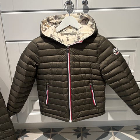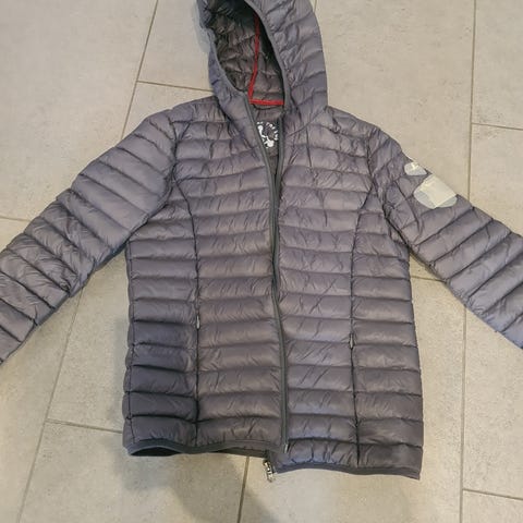 Lett dunjakke med myk bomull på innsiden. Avtagbar hette