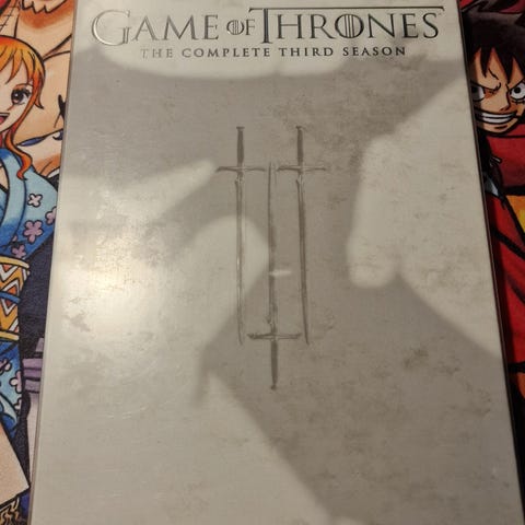 Game of Thrones The Complete Third Season DVD set. Inneholder sesong 3 med flere episoder fordelt på fire DVD-plater. Passer for aldersgruppen 15 år og oppover. Produktet inkluderer bonusmateriale og er beregnet for visning på kompatible DVD-spillere.