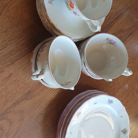 Kaffeservise bestående av 12 asjetter, 11 kaffeskåler og 10 kaffekopper, fløtemugge og sukkerskål.