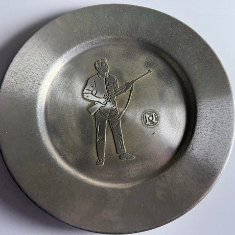 Vintage metallplate innpreget motiv er Tor med hammeren. Fra 60-tallet. Har oppheng bak. Ser ut som et lite skjold. Diameter er 26 cm. Har noe merker og små bulker, men ikke noe skjemmende.