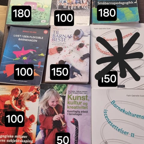 Selger pensumbøker til barnehageutdanning. 150kr pr. Bok, men pris kan evt. diskuteres☺️