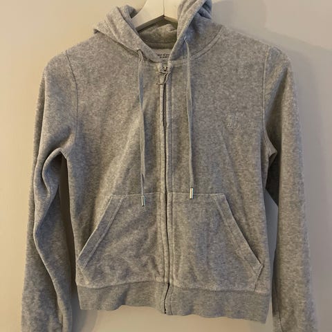 Juicy Couture hettejakke for kvinner i størrelse S. Genseren er grå og har glidelås foran, snøring i hette og lomme foran. Materialet består av 80 % bomull og 20 % polyester.