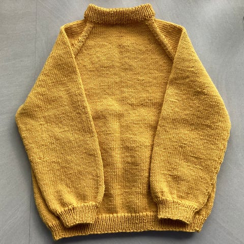 Selger en pen hjemmestrikket genser med hals. Anslår den til ca 4-6 år i str.
