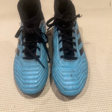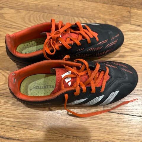 Adidas Predator fotballsko i størrelse 37 1/3. Skoene har gul og svart farge, laget for fotballspill med knotter under for godt grep på gressbaner. Materialet er syntetisk, og skoene er designet for junior/størrelse barn.