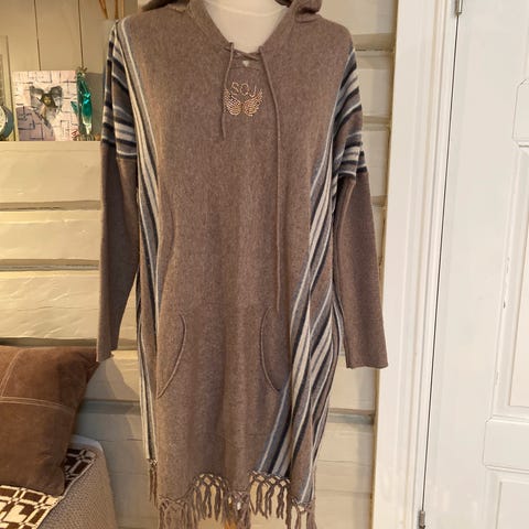 Vedlig deilig lang poncho med armer og hette. God og varm. Fine detaljer. Nypris 1500kr