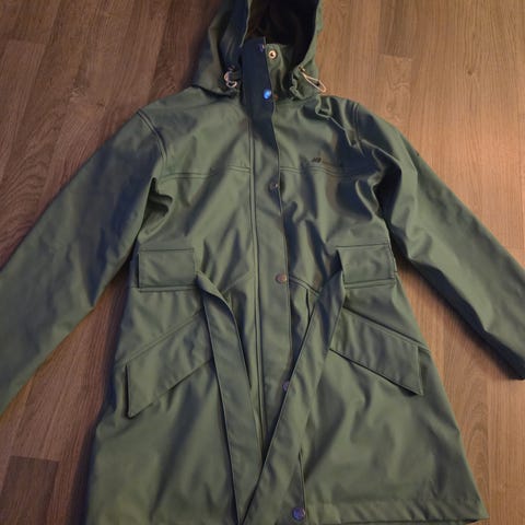 Skogstad regn jakke for unisex i størrelse (10), jeg tror 146. Jakken har blå farge med stripete mønster og er laget for barn. Den passer til utendørs bruk og gir beskyttelse mot regn.