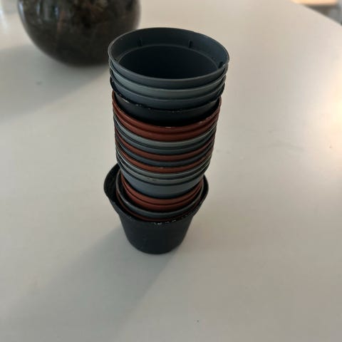 Store hagepotter gis bort mot henting. Buskene som står oppi og jord må tas med ved henting.