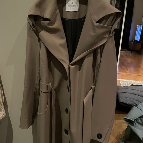 Riccovero sin tidløse signatur kåpe Calli Trench. Klassisk smal passform, høy krage og belte i livet som gir kåpen en feminin fasong. Knepping helt ned. Tilhører Essential kolleksjonen. Kåpen er laget av et teknisk stoff som både er pustende og vannavstøtende. Størrelse 42.