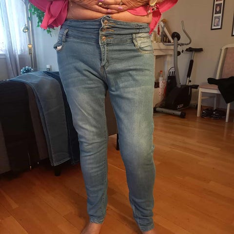 Moderne lysblå damejeans, stretch, størrelse XL. Jeansen har revner som en del av designet, og er laget i et materiale som gir en tettsittende passform.