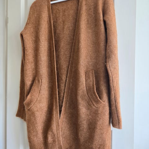 Cardigan fra H&M i størrelse XS. Cardiganen er brun og laget av et mykt materiale. Den har to lommer foran og en åpen front uten knapper eller glidelås. Inneholder 34% mohair og 34% ull. Veldig myk og god.