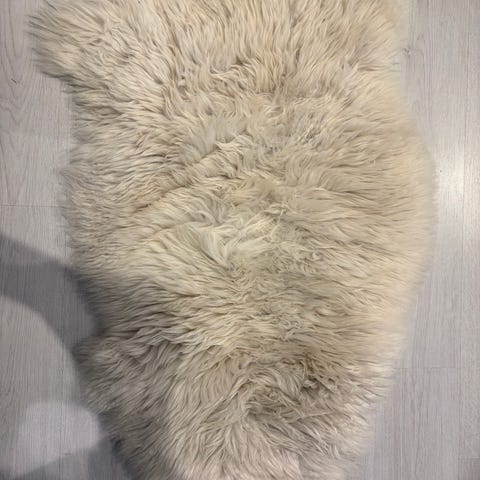 Saueskinn med naturlige farger. Produktet har lang, krøllete ull og er egnet for bruk som dekorasjon eller varmeelement i hjemmet.