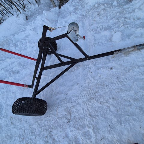 Nesten ubrukt rundballhenger for bil / ATV, som gjør det enkelt å frakte en rundball fra A til B. Rygg hengeren inn under rundballen så spydene får godt tak, vinsj deretter rundballen enkelt opp med den manuelle vinsjen påmontert på hengeren. Hele operasjonen er vist enkelt her: https://youtu.be/fEb_hNKNenk?list=TLGGXX23Wy8177cxNjA5MjAyNQ.
