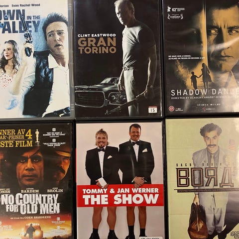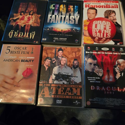 Pakke med 20 forskjellige DVD-filmer i ulike sjangre og titler. DVD-ene inkluderer filmer som Hot Fuzz, Hitman Extended Edition, Best of the Best 2, Mr. & Mrs. Smith, og flere. Hver DVD er i standard størrelse og format, egnet for avspilling på vanlige DVD-spillere. Filmene er på engelsk og leveres i original DVD-emballasje.