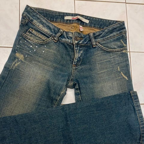 Unike vintage only jeans med rette ben. Typisk 00s wash. Veldig low waist. «Diamanter»/bling under høyre lomme.