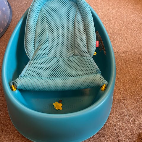 *babybadekar* med en *innebygd nettingstøtte* som gjør bading tryggere og mer komfortabel for små babyer, enkel oppbevaring eller tørking. Egnet for nyfødte og spedbarn opptil ca. 6 måneder.