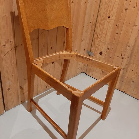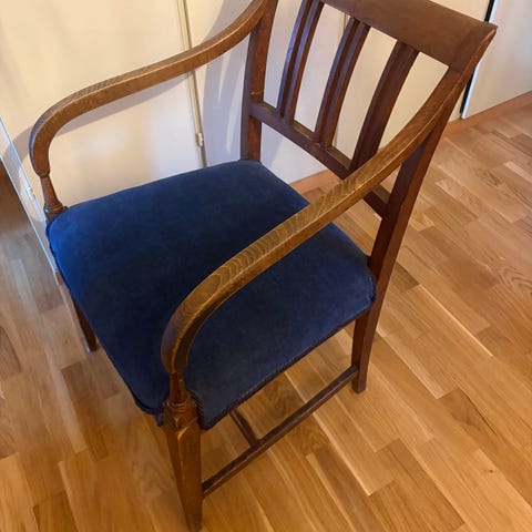 Stol med polstret sitteflate i mønstret stoff. Stolen har en ramme av tre med en enkel design og armlener. Passer til bruk som spisestol eller kontorstol.