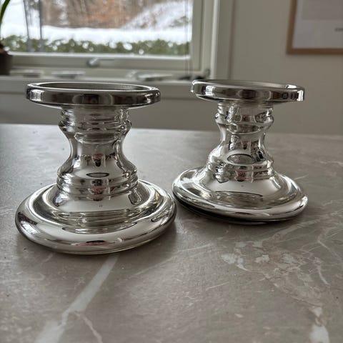 Lysestaker fra Ikea selges samlet i ett sett. En høyere stake enn den andre. Noen bruksmerker i selve feltet der lyset skal stå.