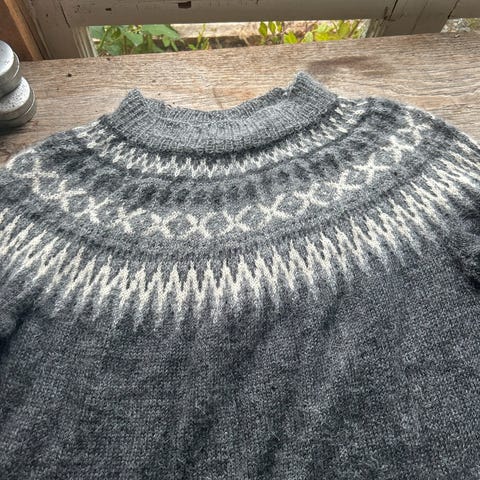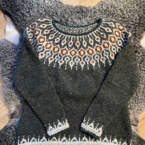 Retrogenser str M strikket i Peer gynt garn.