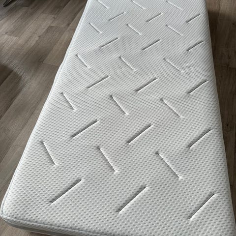 Gold F85 90 x 200 hvit/lys grå selges. Eksklusiv, 22 cm tykk madrass med kjerne av 16 cm kaldskum og 4 cm trykkavlastende AIR memoryskum. Produsent Jysk.