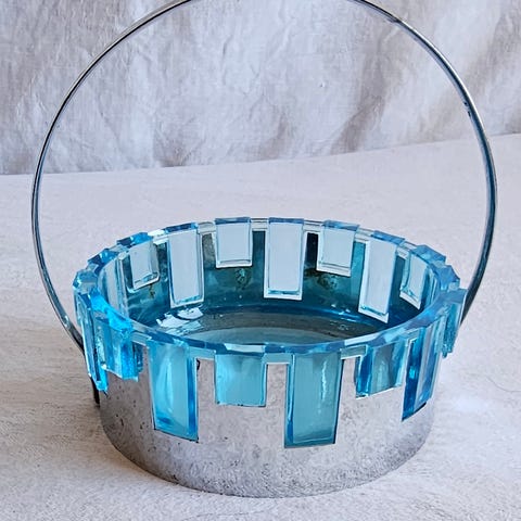 Mørk blå, tung skål, bolle, fat med forsølvet kant og håndtak i metall