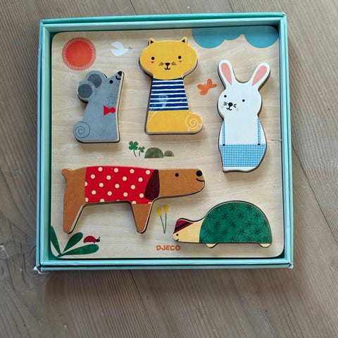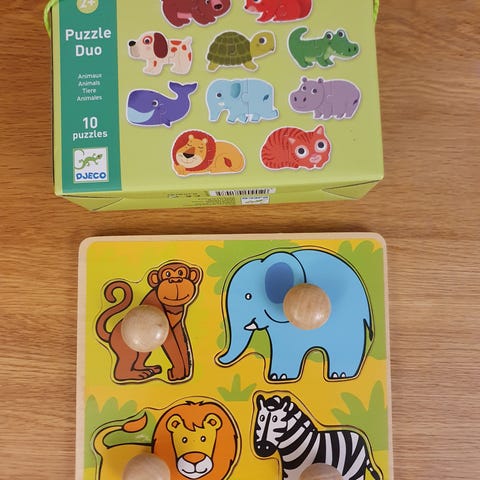 Djeco Woodjungle trepuslespill med 5 deler i tre. Puslespillet består av dyrefigurer som elefant, sjiraff, tiger, fugl og krokodille. Passer for barn fra 12 måneder og oppover.