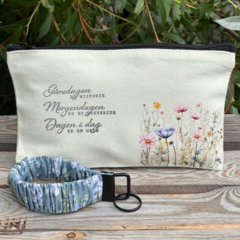 Søt sminkepung/ pouch/pennal av 100% kanvas med matchende scrunchie nøkkelarmbånd. Pungen som måler 12x20 cm.er dekorert av meg med sublimering og trykk. . Armbåndet har jeg sydd av 100% bomullstoff. Stødig og god strikk og sølvfarget metallspenne. Selv greier jeg meg ikke uten disse nøkkelarmbåndene😊De hjelper meg å ha hendene frie når jeg feks.handler,bærer og jeg slipper rote rundt i veska etter nøkkelknippet😊 Kan kombineres ved å knipse pungen inn på nøkkelknippet eller splittes opp og evt. også brukes som to gaver🥰 Se gjerne de andre annonsene mine med div. håndbroderte og sublimerte klær,vesker,hodeplagg,bilder mm😊