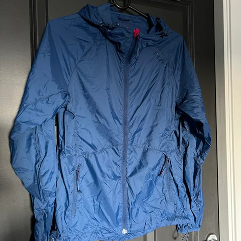 Grønngrå jakke med marineblå detaljer. Fin til høst/vår. Innsvinget og feminin. Belte kan reguleres og dermed passe ung jente i vekst i flere år, tenåringer. Hette og kommer. Kvalitetsmerke: https://bombers-original.com/collections/femme-1