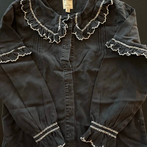 Mørk blå bomullsbluse fra Zoey i str M (46/48) med mange fine detaljer. Puffermer.