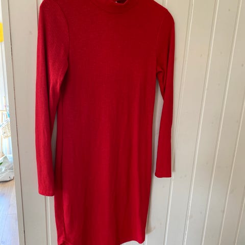 Deilig, lun, rød vinterkjole selges. A- formet skjørt. Strikket mønster( fletter) i to varianter. Rullekrave.